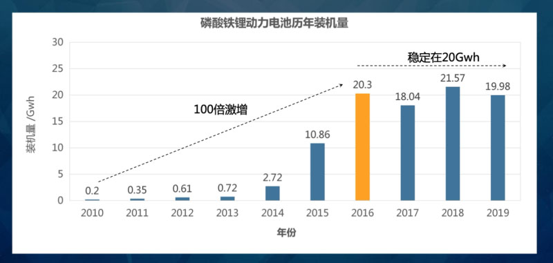 回望磷酸鐵鋰電池在國內(nèi)的發(fā)展,從裝機量來看,從2010年的0.2GWh到2016年的20.3GWh,其實現(xiàn)了7年100倍的激增。到2016年之后,穩(wěn)定在每年20GWh的狀態(tài)。