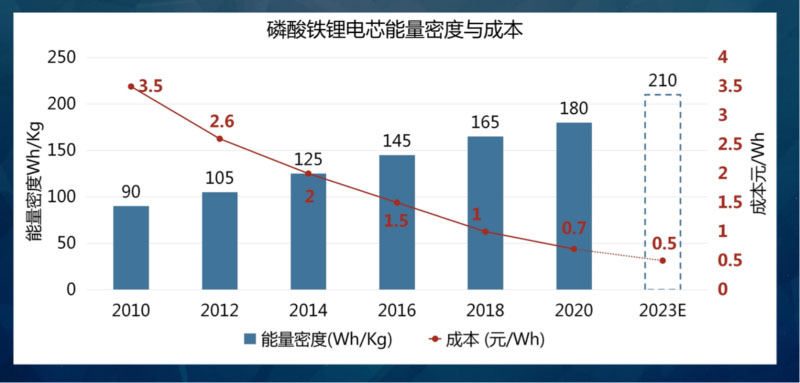 白科預(yù)測,到2023年,磷酸鐵鋰的能量密度增加會逐步放緩,能接近210Wh/kg,成本則下降至0.5元/Wh。