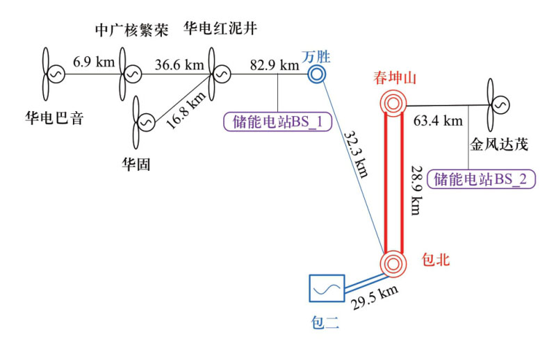 由于風(fēng)電場(chǎng)之間地理和電氣距離較遠(yuǎn),單個(gè)儲(chǔ)能發(fā)電單元或電站建立的電源在經(jīng)過不同變電站間多次電壓變換后,可能會(huì)因線路和變電設(shè)備的損耗大或動(dòng)態(tài)無(wú)功調(diào)節(jié)要求高,使得風(fēng)電機(jī)組難以可靠啟動(dòng),因此需分析儲(chǔ)能選址。多儲(chǔ)能系統(tǒng)協(xié)同風(fēng)電系統(tǒng)作為黑啟動(dòng)電源參與黑啟動(dòng),恢復(fù)供電。