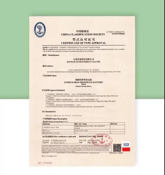 近日,江西星盈科技有限公司(以下簡稱“星盈科技”)SLA45173184-150AH磷酸鐵鋰單體電芯獲得中國船級社(CCS)頒發(fā)的型式認(rèn)可證書,標(biāo)志著星盈科技拿到了進(jìn)軍電動船舶市場的通行證。
