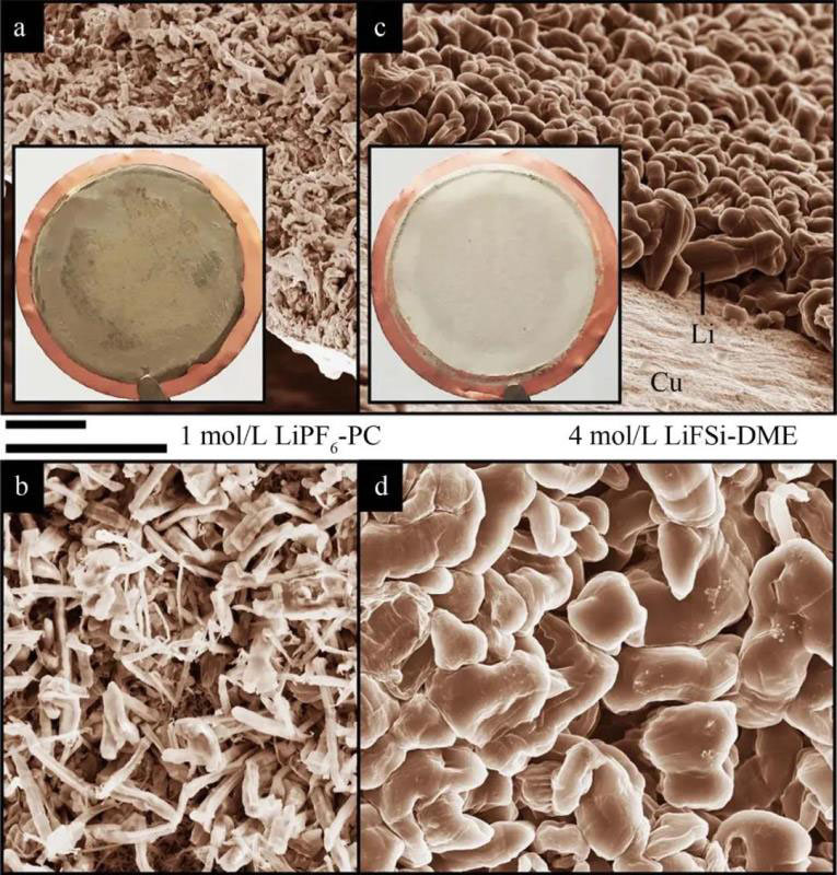 圖7 在(a,b)1 mol/L LiPF6-PC和(c,d)4 mol/L LiFSI-DME電解液中,沉積在銅基底上的鋰金屬形貌的SEM圖;內(nèi)插圖(a,c)中的銅基底直徑為2 cm;標尺為10 mm