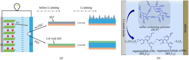 圖4 (a)加入或不加FEC的1.0 mol/L LiPF6/EC-DEC (體積比1∶1)電解液體系對鋰金屬負極的效果;(b) SCP分解后能提供有機組分(有機硫/有機聚硫化物)和無機組分(二硫化鋰/硫化鋰)的示意圖