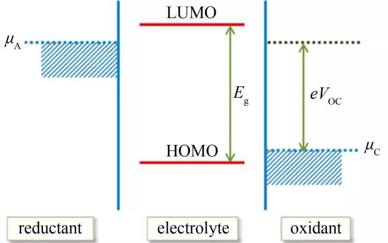 圖2 電極和電解液無反應(yīng)時電解液(固體電極體系的液體電解液)窗口Eg和電極電化學(xué)電位μA和μC的相對能量