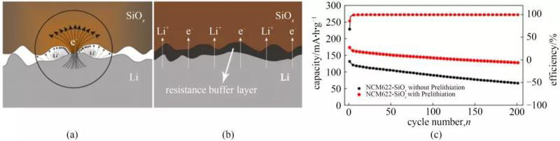 圖10 鋰離子和電子在(a)直接接觸成鋰前過程和(b) RBL調(diào)節(jié)的成鋰前過程中的轉(zhuǎn)移; (c)預(yù)鋰化負(fù)極(紅線)和未預(yù)鋰化(黑線)比容量