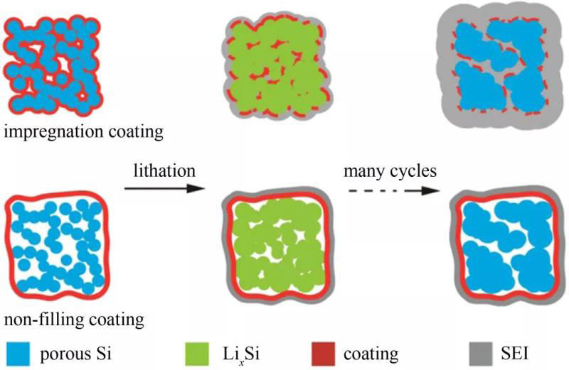 圖6 介孔硅微粒子涂層設(shè)計(jì)原理及其循環(huán)過程中的結(jié)構(gòu)演變
