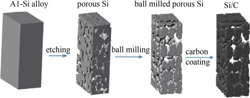 圖1 從Al-Si合金到Si/C復(fù)合材料的制備工藝