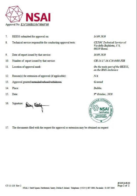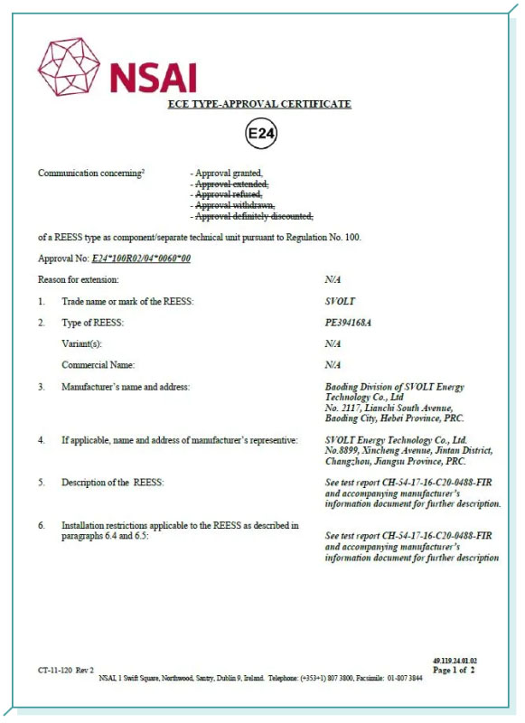 此次頒發(fā)的電池包E-Mark證書(E24)為愛爾蘭交通部授予,愛爾蘭交通部屬于歐洲經(jīng)濟(jì)委員會(huì)(Economic Commission for Europe, 簡(jiǎn)稱ECE)成員國(guó)的政府部門。凡產(chǎn)品進(jìn)入歐洲市場(chǎng)前必須取得此認(rèn)證,并可以在所有成員國(guó)市場(chǎng)都能進(jìn)行銷售。