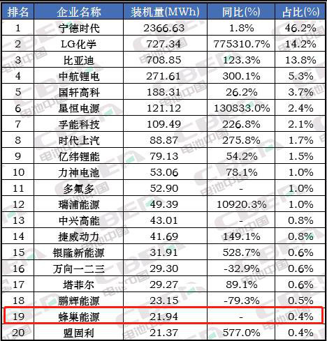 蜂巢能源今年8月動(dòng)力電池裝機(jī)量在中國(guó)市場(chǎng)排名