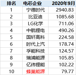 2020年9月中國(guó)市場(chǎng)動(dòng)力電池裝機(jī)量TOP10