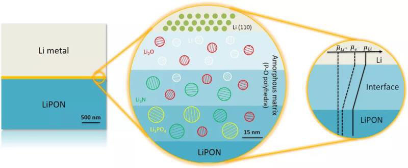 根據(jù)上述實驗結(jié)果,76nm厚的Li/LiPON界面的SEI結(jié)構(gòu)由Li2O、Li3N和Li3PO4組成,N和P元素沿相間的濃度梯度分布,從而提出了多層馬賽克SEI結(jié)構(gòu)和Li/LiPON相間的反應(yīng)機理。這種具有離子導(dǎo)電但電子絕緣的具有梯度結(jié)構(gòu)的界面薄能夠降低鋰金屬負極的活性,然而當SSE的分解產(chǎn)物是混合電子和離子導(dǎo)體時,這種顯著的鈍化效果是無法實現(xiàn)的。在Li/LiPON界面形成過程中,LiPON分解產(chǎn)生了更小的結(jié)構(gòu)單元及原子,同時由于擴散勢壘相對較低,在界面反應(yīng)的影響下,含N和P組分向金屬鋰方向發(fā)生擴散,Li3N和Li3PO4具有高離子導(dǎo)電但電子絕緣,實現(xiàn)了界面穩(wěn)定。