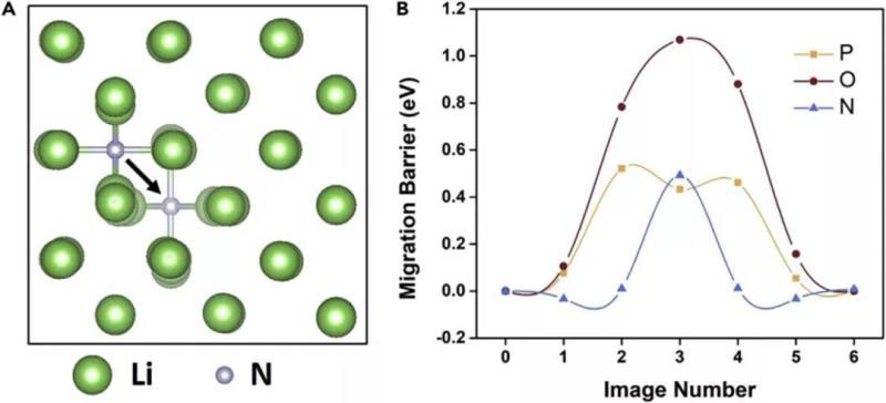 圖5.間隙擴散。(A,B)分解的LiPON組分可能通過間隙擴散(A)的示意圖和過渡態(tài)計算表明鋰金屬中P、O和N的擴散勢壘。