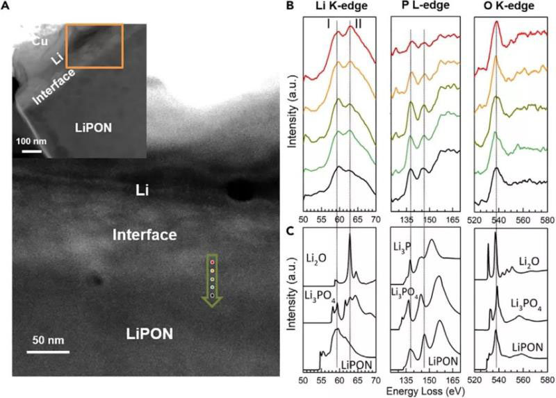 為了進一步研究Li/LiPON界面的化學(xué)演化,進行了Cryo-STEM-EELS圖譜分析。同時使用FEFF9軟件模擬了Li2O、Li3PO4、Li3P和LiPON對應(yīng)邊緣的EELS光譜,其非晶態(tài)LiPON結(jié)構(gòu)由分子動力學(xué)模擬(AIMD)生成。在LiPON區(qū)域(圖3B中的黑色光譜)中,實驗測量的Li K-edge, P L-edge和O K-edge的EELS光譜與圖3C中LiPON對應(yīng)的模擬EELS光譜一致。當從界面向LiPON區(qū)域移動時,實驗中Li K-edge光譜中的兩個主峰(峰I為LiPON,峰II為Li2O)的強度比增加,表明Li2O和LiPON都對K-edge有貢獻,Li2O的貢獻隨著靠近LiPON區(qū)域而減小。