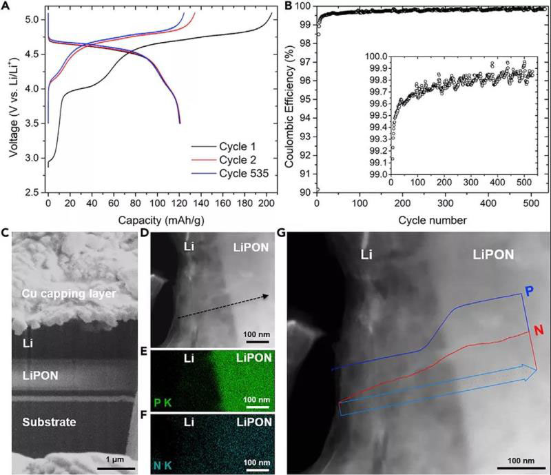 圖1.Li/LiPON/LNMO全電池電化學(xué)性能和Cryo-STEM EDS結(jié)果。(A)第1、第2和535圈循環(huán)的電壓曲線;(B)循環(huán)500圈的庫倫效率;(C)Li/LiPON界面的Cryo-FIB-SEM橫截面圖像;(D)Li/LiPON界面Cryo-STEM暗場圖像;(E,F(xiàn))磷和氮在Li/LiPON界面的EDS映射;(G)磷和氮元素沿D圖中的黑色虛線的EDS線掃。