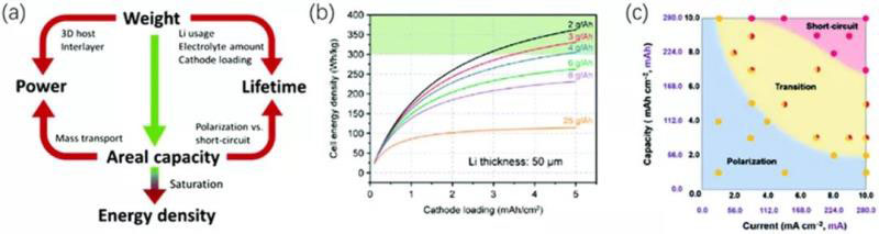 圖8.(a)實用的鋰金屬電池的各個方面的關(guān)系(b)50μm的鋰箔負(fù)極8層陰極的袋裝電池在各種負(fù)載和電解質(zhì)含量下的電池能量密度(c)鋰金屬負(fù)極在不同工作條件下的電化學(xué)圖