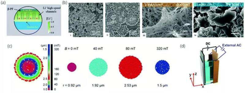 圖7.(a)壓電覆蓋層的示意圖(b)醚類、碳酸鹽電解質(zhì)中有無磁場的鋰沉積SEM示意圖(c)鋰成核尺寸在不同磁場大小的示意圖(d)施加外部交流電場的完整電池的示意圖