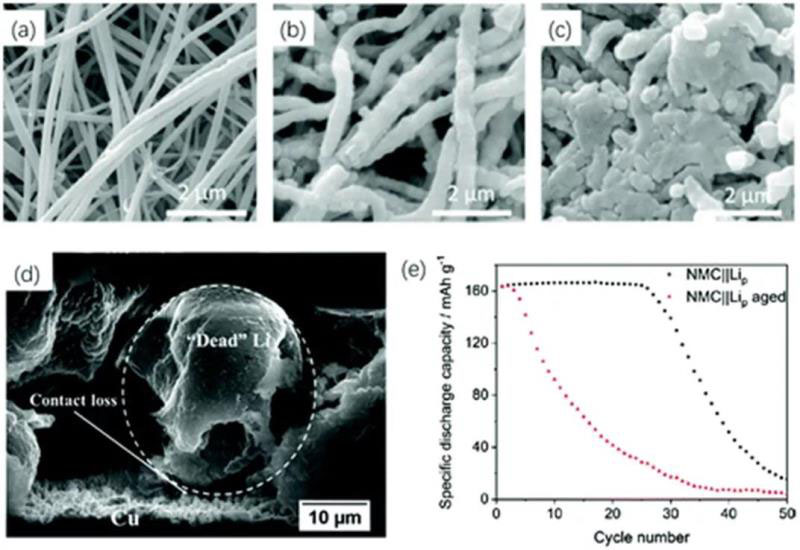 圖6.(a-c)經(jīng)過0、10、30個循環(huán)后SEI在支架上積累的SEM圖像,可以看到,30周循環(huán)后(c)的支架直徑和形態(tài)由于SEI層的積累發(fā)生了變化,這一過程同時會導(dǎo)致電解質(zhì)和鋰的雙重消耗(d)鋰顆粒被腐蝕的SEM圖像(e)原始鋰粉負(fù)極的完整電池的循環(huán)性能和老化一周的電池的循環(huán)性能對比