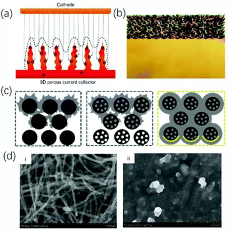 圖5.(a)3D多空銅集流體的示意圖(b)鹽酸腐蝕Cu-Zn的合金示意圖(c)在CNF、多通道CNF、和有Au的多通道上的鋰金屬沉積示意圖(d)10mAh/cm2電流密度下沉積鋰前后的CNT的SEM示意圖