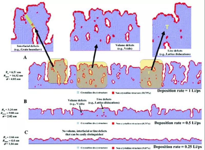圖2. 分子動力學(xué)模擬的不同結(jié)晶速度下鋰金屬的沉積形態(tài)。更快的結(jié)晶速度(A.)導(dǎo)致了內(nèi)部缺陷空間的形成,而較低的沉積速率(B.C.)則有著更好的沉積形貌。