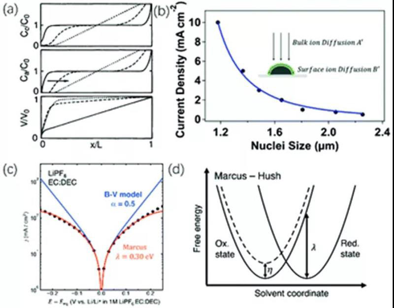 圖1.(a)歸一化陽離子濃度(上),歸一化陰離子濃度(中)相對于整體電解質(zhì)濃度C0,歸一化靜電勢相對于總電勢降(下)的變化取決于離開負(fù)極表面的歸一化距離。(b)鋰沉積的成核尺寸和電流密度關(guān)系。(c)Butler-Volmer模型(藍(lán)線)和Marcus-Hush模型(紅線)擬合的電流-電壓數(shù)據(jù)和實驗數(shù)據(jù)(黑點)對比,可以看到Marcus-Hush提供了更好的擬合度。(d)氧化態(tài)和還原態(tài)的自由能圖