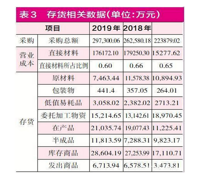 將材料采購金額與營業(yè)成本中消耗的直接材料相減,2018年和2019年分別得到8.33億元和12.11億元的差額,理論上,這部分差額應(yīng)該計入當(dāng)期的存貨變化中,即2018年、2019年存貨中的原材料應(yīng)該分別新增8.33億元和12.11億元。