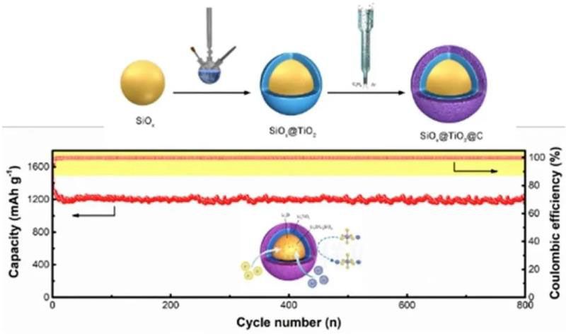 圖2 SiOx@TiO2@C復(fù)合物的制備及循環(huán)特性