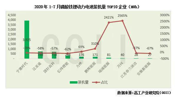 從競(jìng)爭(zhēng)格局來看,2020年1-7月磷酸鐵鋰動(dòng)力電池裝機(jī)量排名前十企業(yè)合計(jì)占比約99.5%,其中寧德時(shí)代占據(jù)63.07%的份額,較去年同期份額占比提升9.34個(gè)百分點(diǎn)。值得關(guān)注的是鵬輝能源、瑞浦能源、萬向三家動(dòng)力電池企業(yè)磷酸鐵鋰裝機(jī)量較去年同期出現(xiàn)大幅上漲,分別增長(zhǎng)3倍、24倍、26倍。