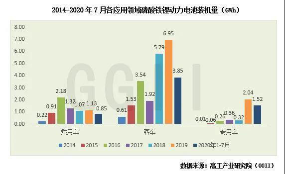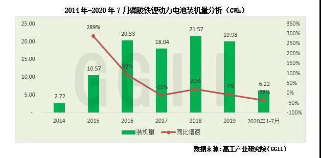 通過高工產(chǎn)業(yè)研究院(GGII)發(fā)布的《動(dòng)力電池月度數(shù)據(jù)庫(kù)》統(tǒng)計(jì)顯示,2020年1-7月磷酸鐵鋰動(dòng)力電池累計(jì)配套新能源汽車約6.9萬輛,同比下降15%;裝機(jī)量合計(jì)約6.22GWh,同比下降38%。