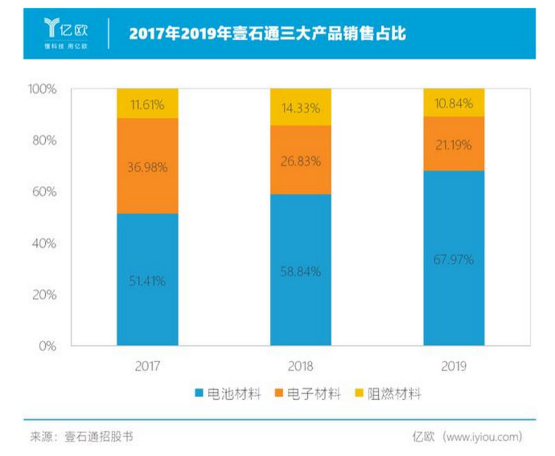 現階段,壹石通主營產品主要是電池材料、電子材料和阻燃材料三大類,其中電池材料貢獻最大。2017 年至 2019 年,壹石通電池材料銷售收入快速增長,分別為 3,874.77 萬元、6,798.04萬元和 11,222.36 萬元,占營業(yè)收入的比重分別為51.41%、58.84%和 67.97%;而電子材料和阻燃材料這兩類產品的銷售收入則處于穩(wěn)定狀態(tài)。