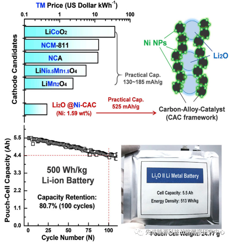 南京大學(xué)Haoshen Zhou教授研究團(tuán)隊(duì)設(shè)計開發(fā)了一種穩(wěn)定的、大容量基于陰離子氧化還原活性的正極材料體系,應(yīng)用于鋰金屬(Li)軟包全電池,通過氧化鋰(Li2O)與過氧化鋰(Li2O2)之間的可逆轉(zhuǎn)化,顯著提升了電池器件的性能,首次獲得了超越500 Wh/kg的能量密度,且電池穩(wěn)定循環(huán)100余次后仍可獲得大于400 Wh/kg的能量密度,更為關(guān)鍵的是該電池鎳金屬的含量僅為1.59%(質(zhì)量分?jǐn)?shù)),遠(yuǎn)低于傳統(tǒng)的高鎳三元正極,成本更低更適于規(guī)?;a(chǎn),對電池產(chǎn)業(yè)和電動汽車發(fā)展具有重要推動作用。相關(guān)的研究表明,在Li金屬電池正極材料的設(shè)計過程中,不局限于傳統(tǒng)過渡金屬氧化還原提供容量,利用Li2O與Li2O2之間的可逆轉(zhuǎn)化,能夠?yàn)檎龢O體系提供很高的能量密度。理論計算得知,Li2O/Li2O2轉(zhuǎn)化的理論能量密度高達(dá)2565 Wh/kg。為此研究人員利用濕化學(xué)法制備了Li2O基正極材料,同時為了提升無氧氣析出的“安全”充電深度,研究人員同時制備了匹配的鎳基碳合金導(dǎo)電催化框架(Ni-CAC)包覆Li2O形成Li2O@Ni-CAC電極體系,一方面有助于提升電池性能,另一方面有利于減少鎳金屬使用量降低成本。接著以Li2O@Ni-CAC和Li為正負(fù)極,醚類溶劑為電解質(zhì)組裝成完整的軟包電池,并開展電化學(xué)性能測試。原位氣相質(zhì)譜和拉曼光譜實(shí)驗(yàn)顯示,在充電過程中存在明顯的Li2O向Li2O2的轉(zhuǎn)化過程,且Li2O@Ni-CAC電極體系的可逆“安全”充電深度為750 mAh/g(基于Li2O活性物質(zhì)質(zhì)量),一旦超過這一數(shù)值就會出現(xiàn)不可逆的氧氣析出。隨后控制充電深度不超過750 mAh/g,進(jìn)行充放電循環(huán)測試,發(fā)現(xiàn)電池可以穩(wěn)定可逆循環(huán)100余次,且能量密度高達(dá)950 Wh/kg(考慮到所有電極材料質(zhì)量的前提下,但不包括軟包外殼);而在計入軟包外殼后,電池依然獲得了超越500 Wh/kg的能量密度,達(dá)到了513.5 Wh/kg,這是目前文獻(xiàn)報道的能量密度最高的軟包電池(計入整個軟包電池質(zhì)量后),且電池穩(wěn)定循環(huán)100余次后,輸出能量密度仍然高于400 Wh/kg,表現(xiàn)出優(yōu)異的循環(huán)穩(wěn)定性。