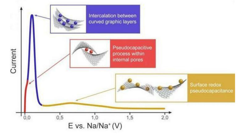 鈉是地殼中第六大常見元素。與鋰相比,其鹽類的價格要便宜100倍左右。雖然在化學(xué)性質(zhì)上與鋰相似,但鈉還有其他的區(qū)別,這就需要在SIB設(shè)計中采用新的方法。電池由三個主要部分組成:陰極、陽極和電解質(zhì)。陰極或電解質(zhì)的成分和結(jié)構(gòu)有廣泛的多樣性,而陽極仍然是一個絆腳石。成功用于LIB的石墨不能用于SIB,因為碳六邊形和鈉陽離子的尺寸相差太大,無法提供夾層。硬碳似乎是唯一可以真正用于陽極的材料。由扭曲的石墨狀層的不規(guī)則排列形成的硬碳表現(xiàn)出與LIB中的石墨相當(dāng)?shù)拟c離子存儲性能,然而仍然不清楚為什么以及如何發(fā)生這種情況。