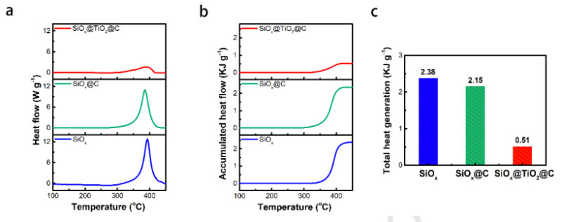 圖8b和8c比較并計(jì)算了累計(jì)熱流量,對(duì)于SiOx@TiO2@C,其放熱量為0.51 KJ g-1,明顯低于SiOx的2.38 KJ g-1和SiOx@C的2.15 KJ g-1。放熱量降低了4倍,顯示了SiOx@TiO2@C的安全性顯著提升。