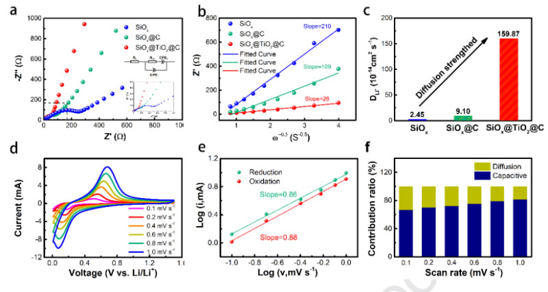 圖6. (a)SiOx、SiOx@C、SiOx@TiO2@C的EIS譜圖及等效電路示意圖.(b)阻抗實(shí)部Z’vs角頻率負(fù)平方根ω-0.5的線性擬合.(c)SiOx、SiOx@C、SiOx@TiO2@C的表觀化學(xué)擴(kuò)散系數(shù)DLi+對(duì)比.(d)SiOx@TiO2@C的不同掃速下CV曲線.(d)對(duì)應(yīng)的b指數(shù)擬合結(jié)果.(e)不同掃速下電容貢獻(xiàn)在總?cè)萘恐械谋壤兓?