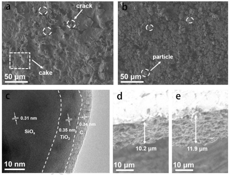 圖5. 循環(huán)前后電極形貌對(duì)比(a)循環(huán)50圈后SiOx電極形貌SEM圖.(b)循環(huán)600圈后SiOx@TiO2@C電極形貌SEM圖.(c)循環(huán)600圈后SiOx@TiO2@C電極 TEM圖. SiOx@TiO2@C電極的循環(huán)前后電極厚度對(duì)比:(d)循環(huán)前,(e)循環(huán)600圈后.