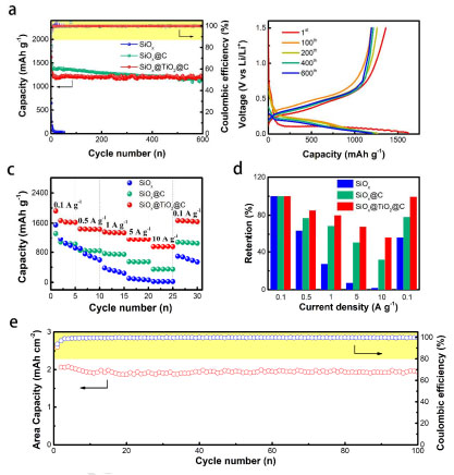 圖4b中循環(huán)過(guò)程容量-電壓曲線也證明了SiOx@TiO2@C電極的高循環(huán)穩(wěn)定性。