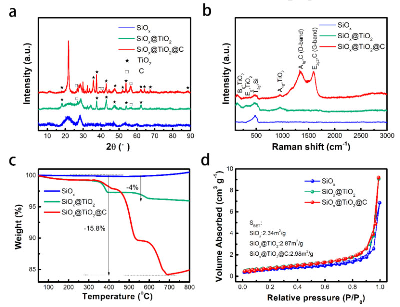 圖3.(a)SiOx、SiOx@TiO2、SiOx@TiO2@C的XRD譜圖.(b)SiOx、SiOx@TiO2、SiOx@TiO2@C的Raman譜圖.(c)SiOx、SiOx@TiO2、SiOx@TiO2@C的TGA曲線.(d)SiOx、SiOx@TiO2、SiOx@TiO2@C的N2吸附等溫線.