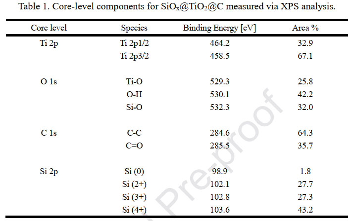 表1. SiOx@TiO2@C的不同元素XPS譜分峰結(jié)果