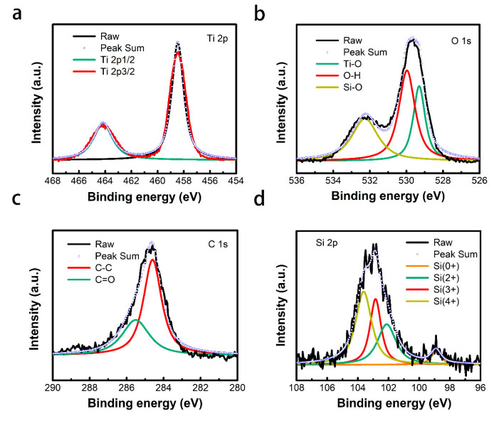 (a)Ti 2p. (b)O 1s. (c)C 1s.(d)Si 2p。