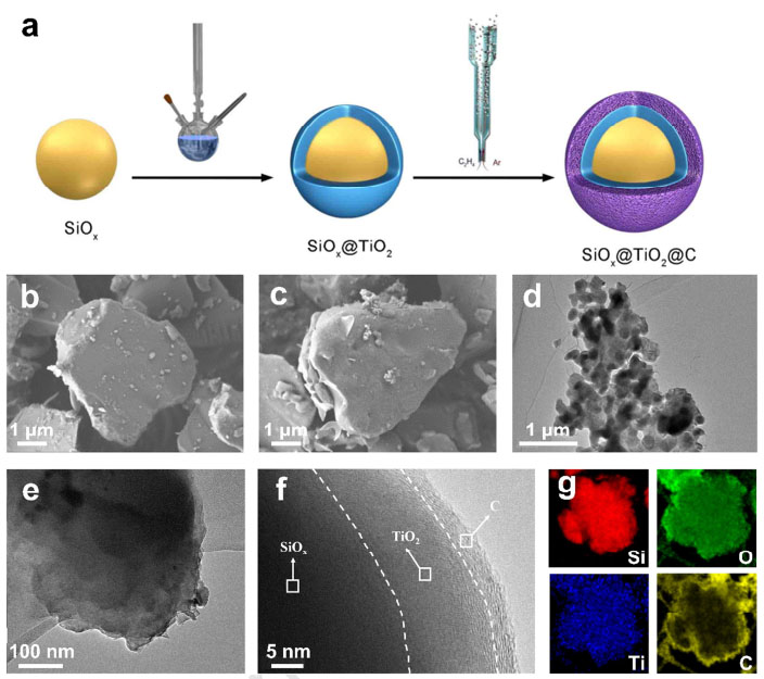 圖1.(a)SiOx@TiO2@C復(fù)合物的制備.(b)原始SiOx的SEM照片. (c)SiOx@TiO2@C復(fù)合物的SEM照片. (d-g)SiOx@TiO2@C復(fù)合物的HR-TEM照片及對(duì)應(yīng)的不同元素EDS掃描圖片。