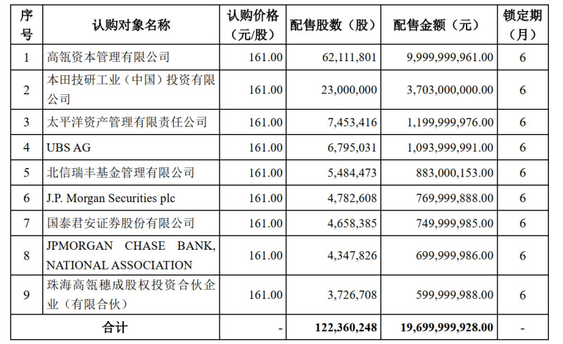 除了高瓴資本之外,認購方還包括本田技研工業(yè)(中國)投資有限公司、太平洋資產(chǎn)管理有限責任公司、UBS AG、北信瑞豐基金管理有限公司、J.P. Morgan Securities plc等。