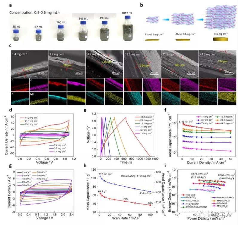 圖5 (a)不同體積膜液的數(shù)碼照片;(b)面擔載量的示意圖;(c) 不同厚度和面擔載量的P-Mn3O4/C膜的斷面SEM和元素mapping圖;(d) 不同面擔載量的P-Mn3O4/C膜的CV曲線(10 mV s-1)和(e)充放電曲線(10 mA cm-2);(f) 不同面擔載量P-Mn3O4/C比電容與電流密度的關(guān)系圖;在不同掃速下,P-Mn3O4/C//AC不對稱電容器的(g)CV曲線和(h) 比電容曲線;(i) P-Mn3O4/C//AC的Ragone曲線及其與文獻報道數(shù)據(jù)的對比圖。