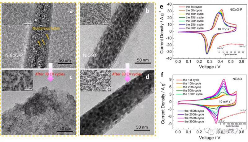 圖4 (a) NiCoO-P和(b) NiCoO的TEM和SEM圖片;(c)NiCoO-P和(d) NiCoO循環(huán)后的TEM和SEM圖片;(e) NiCoO-P和(f)NiCoO不同循環(huán)后的CV曲線和比容量。