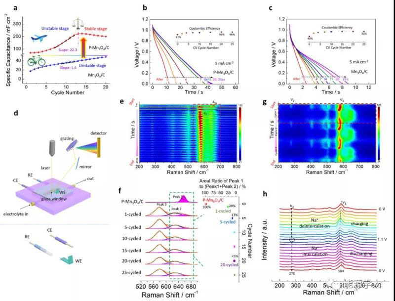圖3 (a) P-Mn3O4/C和(b) Mn3O4/C不同循環(huán)后的比電容對比;(b) P-Mn3O4/C和(c) Mn3O4/C不同循環(huán)后的恒流放電曲線對比;(d) 原位拉曼測試示意圖;(e) P-Mn3O4/C電化學演化過程的原位拉曼mapping圖和(f) 相應的不同循環(huán)后的拉曼圖譜;(g) 相演化后的P-Mn3O4/C在電荷存儲過程中的原位拉曼mapping圖和(h) 相應的不同電壓下的拉曼圖譜。