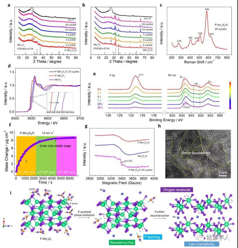 圖2 (a) P-Mn3O4/C和(b) Mn3O4/C不同循環(huán)后的XRD圖;(c) 經(jīng)20次循環(huán)后的P-Mn3O4/C的拉曼光譜;(d) 循環(huán)前后P-Mn3O4/C的Mn K邊XANES對比;(e) P-Mn3O4/C不同循環(huán)后的P 2p和Mn 2p的XPS譜圖;(f) P-Mn3O4/C相演化過程的質(zhì)量變化曲線;(g) Mn3O4/C和循環(huán)前后P-Mn3O4/C的EPR譜圖;(h) P-Mn3O4/C相演化后的HR-TEM圖片;(i) P-Mn3O4/C的相演化過程示意圖。