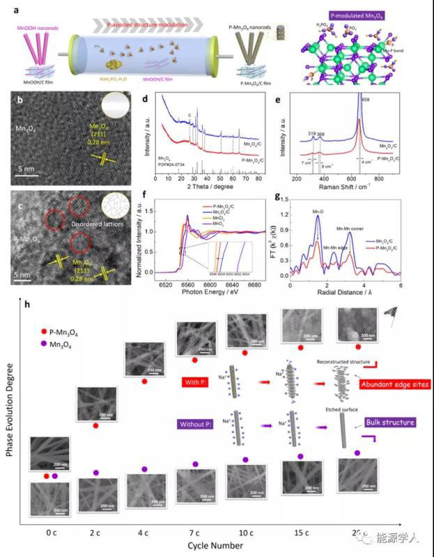 已有研究顯示,在過渡金屬氧化物中引入雜原子(P,S,N,Se…)可以有效調(diào)控其電子結(jié)構(gòu)、反應活性、導電性和表面化學特性。鑒于此,研究人員基于Mn3O4的低價介穩(wěn)的特質(zhì),提出了一種磷誘導的超快相重構(gòu)策略,原位構(gòu)筑了富缺陷、高活性、高穩(wěn)定性的碳耦合MnO2,實現(xiàn)了碳耦合P摻雜Mn3O4(P-Mn3O4/C)自支撐膜電極的超高擔載(44.2 mg cm-2)及電極材料反應動力學過程的強化。此外,研究結(jié)果表明,磷誘導的超快相重構(gòu)策略具有普適性。該工作為過渡金屬化合物活性位和結(jié)構(gòu)缺陷的調(diào)控提供了有效的技術(shù)手段和途徑,對實現(xiàn)傳統(tǒng)材料的改進及升級具有很好的借鑒意義。