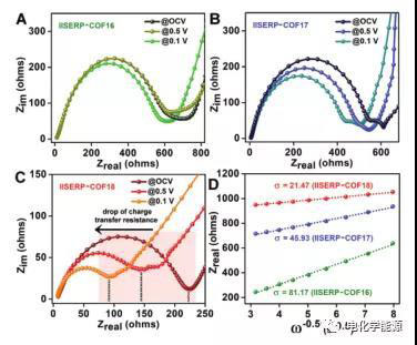 COF衍生半電池的恒電位阻抗測量得到的Nyquist圖、Warburg系數(shù)。