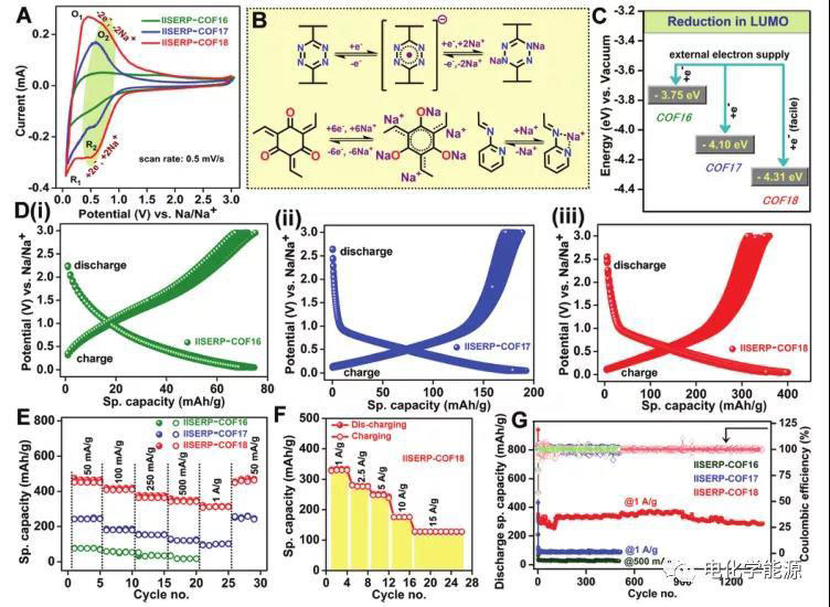 石墨是商用鋰離子電池最常用的陽極。不幸的是,石墨對鈉離子沒有如此好的表現(xiàn)。由于缺乏熱力學(xué)上的有利性,使Na+離子駐留在石墨層間空間中。同時,NaC6和NaC8不穩(wěn)定。此外,由于Na+離子比Li+離子大,鈉離子插入到小的晶格結(jié)構(gòu)中可能伴隨著結(jié)構(gòu)和體積的變化。在許多情況下,這些變化會破壞電極和集電器之間的接觸,導(dǎo)致鈉離子電池在循環(huán)過程中容量下降。然而,在納米結(jié)構(gòu)的COFs中,沒有這些問題,這使得它們更適合具有不同活性位點和可調(diào)節(jié)納米空間的多孔主體。晶體共價有機(jī)骨架(COFs)具有有序的納米通道。當(dāng)這些溝道被氧化還原活性官能團(tuán)修飾后,就可以作為金屬離子電池(LIB和SIB)的陽極。盡管鈉優(yōu)越的相對豐度使其成為比鋰更好的選擇,但較大的鈉離子在能量上的不利嵌入使其與鋰離子電池中使用的商業(yè)石墨陽極不兼容。同時,它們在電極內(nèi)的緩慢運動限制了SIB的快速鈉化。通過化學(xué)操作在電極上產(chǎn)生電子驅(qū)動力是克服這一問題的一種通用方法。近日,印度科學(xué)家Ramanathan Vaidhyanathan等提出了SIB陽極在三個具有幾乎相同的最高占據(jù)分子軌道(HOMO)水平,但不同的最低未占據(jù)分子軌道(LUMO)能級上的SIB陽極。LUMO水平的這種變化是通過將缺電子中心(苯基對四嗪對二吡啶四嗪)取代基包含到組成COF的模塊中而設(shè)計得到的。隨著電池電位的降低,電子積累在反鍵LUMO中。這些電子劑量的LUMO水平成為吸引電解液中緩慢鈉離子的有效陽極。同時,COF的固有孔隙率有利于Na+離子的傳輸和擴(kuò)散。用這些COF制成的電池具有很高的比容量(能量密度)和速率性能(快速充放電),與體積小得多的Li+相比,Na+的這一點并不容易。具有最低LUMO能量的二吡啶四嗪COF的比容量為340mAh/g(電流密度為1A/g)和128mAh/g(電流密度為15A/g)當(dāng)電流密度從0.1A/g增加到1A/g時,只有24%的下降,這是所有性能最好的COF衍生鈉離子電池陽極中最低的。