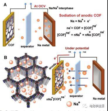A) COF衍生半電池(SIB)的放電或防護(hù)機(jī)制。(B) 在外加電位下,Na+離子向帶負(fù)電的COF移動。由陽極上外部供應(yīng)的電子的積累引起的鈉離子流向陽極的流動。