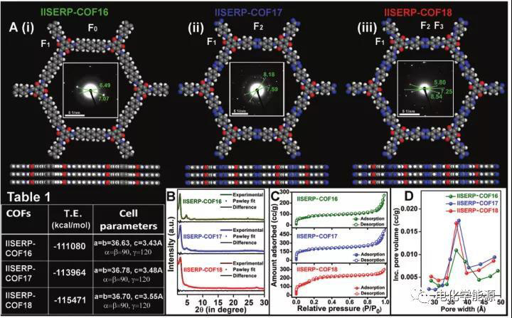 COFs結(jié)構(gòu)、幾何優(yōu)化COF的總能量和單位電池參數(shù)、在77k下測定了COFs的氮(N2)吸附等溫線、從BJH獲得的COFs的孔徑分布圖符合解吸分支