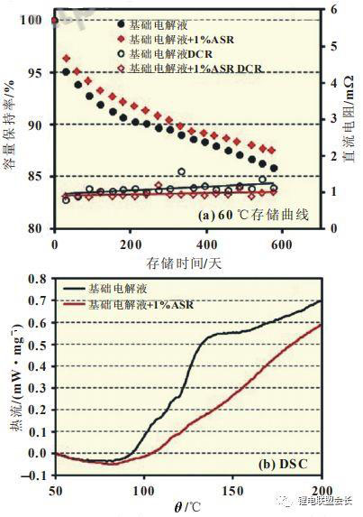 因為電池高溫存儲過程中的容量損失主要來自陽極表面的副反應造成的活性鋰離子損失,所以在電解液中添加SEI膜熱穩(wěn)定添加劑(ASR)可以提升SEI膜的高溫穩(wěn)定性,降低陽極表面的副反應活性,減少活性鋰離子損耗。