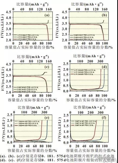 圖3(d),(e),(f)中,存儲181和575d電池陽極首次充電比容量分別為未經存儲電池陽極首次充電比容量的90.4%和84.5%,與實際電池的容量保持率接近。所以,電池容量衰減的主要原因是全電池中活性鋰離子的損失。
